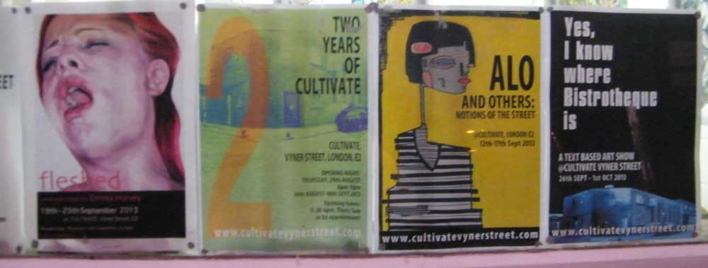 Cultivate has not been about the establishment art world, it has not been about the art-school way, it has not been about that tiny little self-indulgent middle class closed-door uncomfortably-elite world. Cultivate has been about an alternative, about people, about reality, about engaging, about defiant survival, about a little bit more than drinking cheap wine with your small circle of very loud ex-art school mates at an unwelcoming private view. Cultivate has been about personal sacrifice, frustration, about fun – art and fun, two words you don’t often see together, Cultivate has been about walking it, about doing it, trying to enjoy it. And inevitably Cultivate will be a failure, the doors will once again close, the white stenciled name on the front will be painted over and it will all be forgotten about – for now it is there, we know it is there, the bus drivers know it is there, one or two artists will know it was there, the ex-foot model pensioner who says she knew the Krays, and who says she loves to come in, knows it is there – she tells great tales about how the ultra-fashionable, too cool to have a sign Bistrotheque was a slaughter house and how blood really did run in the street back then.