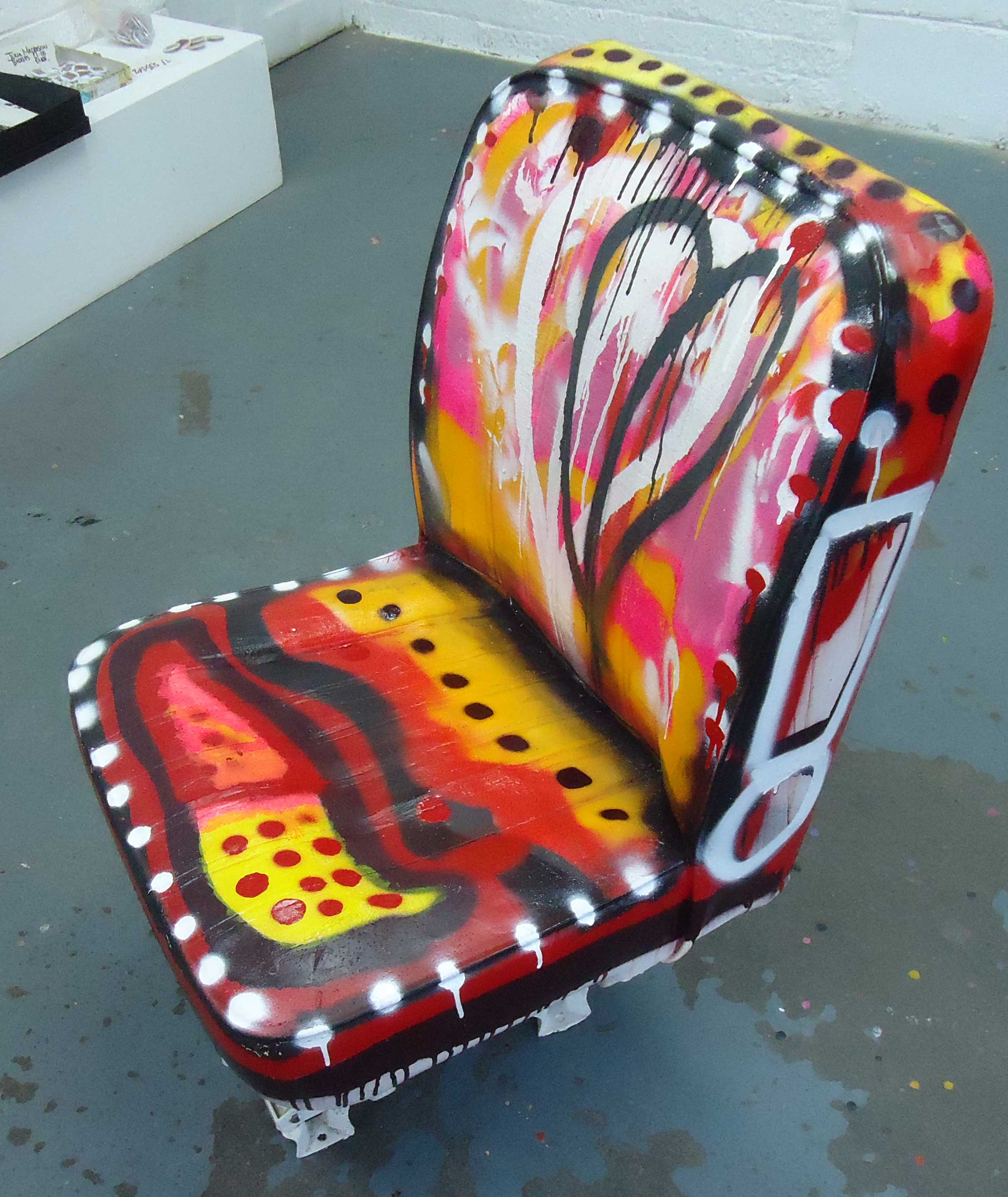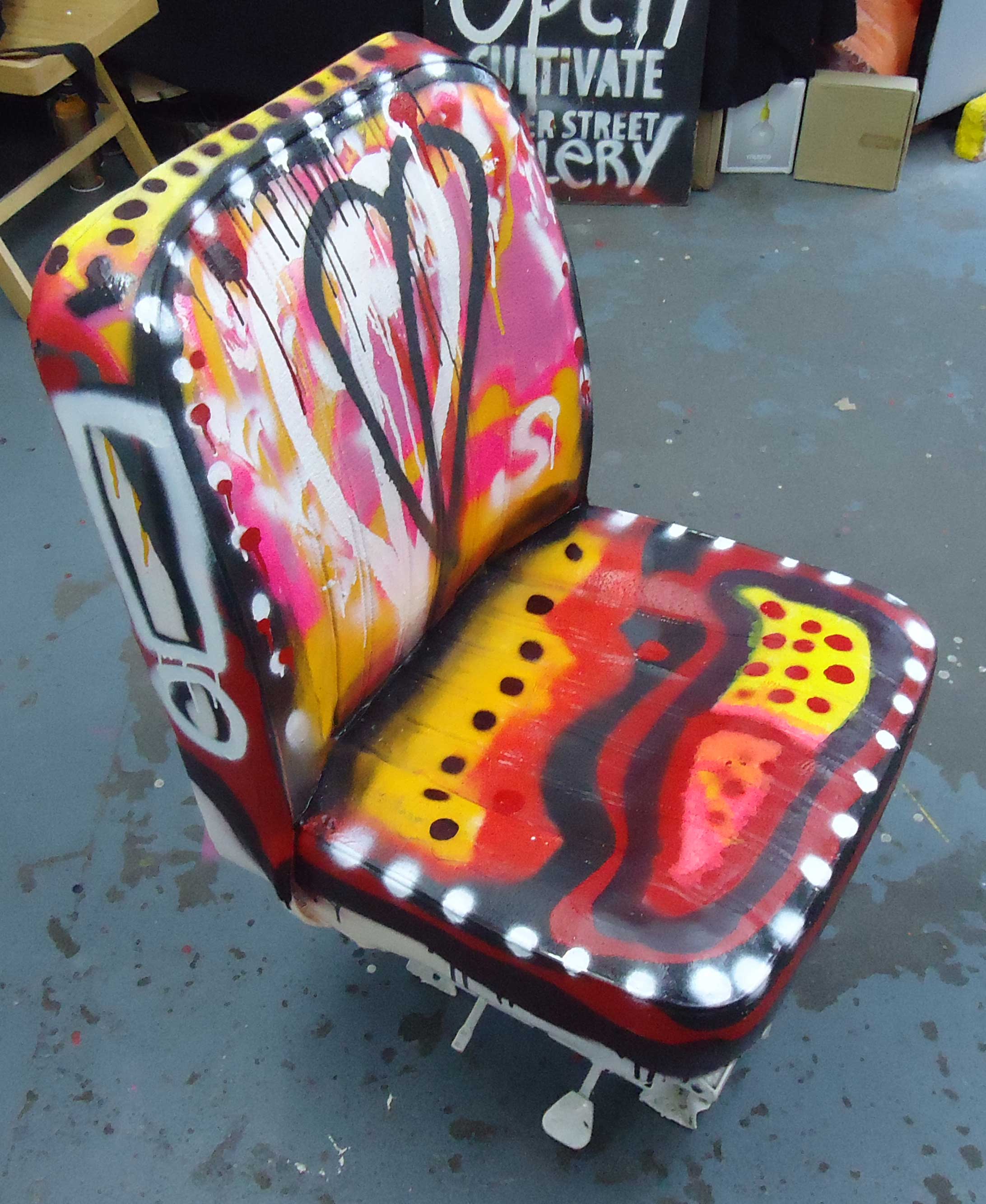 The taxi driver’s seat that was painted in the gallery, by me (Sean Worrall), could now be yours for just 1p, well that’s how much it is right now over on Ebay. The auction runs for seven days and ends on Tuesday 12th November. We got rent bills to pay so watch this space for more auctions…. Before you bid, please be aware that you will need to pick this piece up from the gallery yourself.