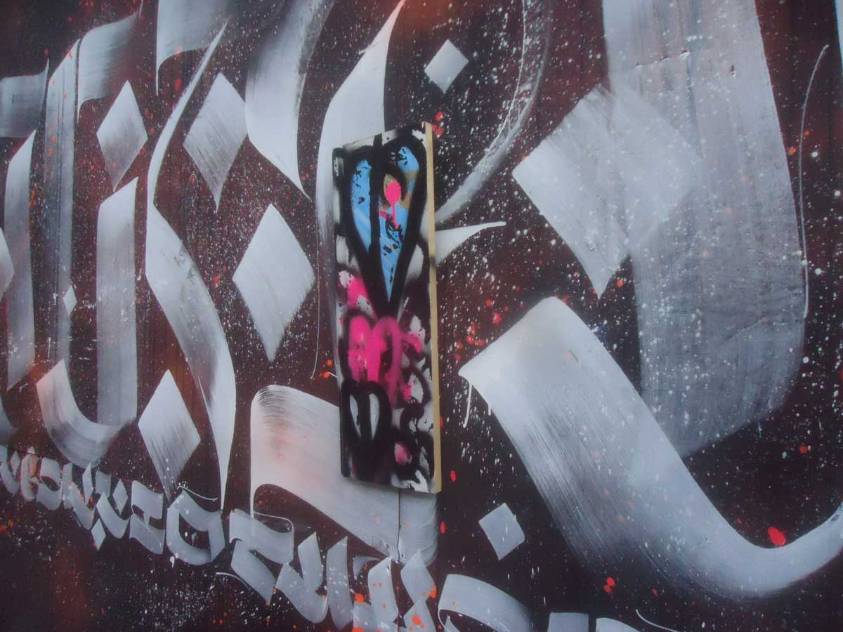 On with the carefully placing of the so called #365ArtDrops, never actually dropped of course, always carefully placed, stung and then hung. Part 217 of the 365 pieced piece of work was hung on a nail on a street corner on Brick Lane a week or so ago, painted on a piece of offcut garden decking and hung in the East End of London, the piece appeared on Twitter, in the hands of this little girl, via an art gallery in Margate. No idea how it got from the East End to a gallery in Margate, and of course, once I “drop” a piece it is not for me to say what happens, several have turned up on gallery walls now. Great photo of the finder of the piece…