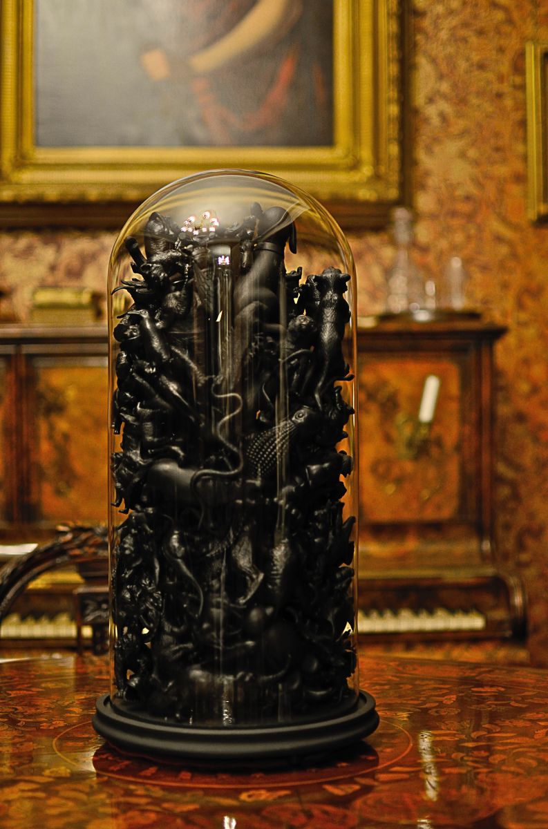 102_jane_fairhurstglut_2 Published April 24, 2017 at 793 × 1200 in CULTIVATE PRESENTS: Something Black, An Art Exhibition… ← Previous Next → 102: Artist: JANE FAIRHURST, Title: Glut (2011), Medium:, mixed media, a Victorian glass display dome filled with plastic toy animals painted matt black. Size: 54 x 26 x 26cm