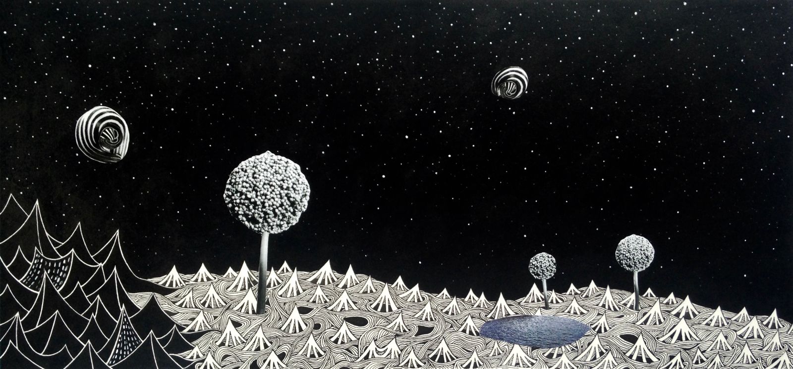 85_frankie_gao__galaxy_far_far_away2 Published April 24, 2017 at 1600 × 746 in CULTIVATE PRESENTS: Something Black, An Art Exhibition… ← Previous Next → 85: Artist: FRANKIE GAO, Title: In a Galaxy Not So Far Far Away (ongoing series, 2017). Medium, Ink, water colour, collage on hot press. Size: 17cm x 36cm; 18cm x 36cm; 26cm x 56cm